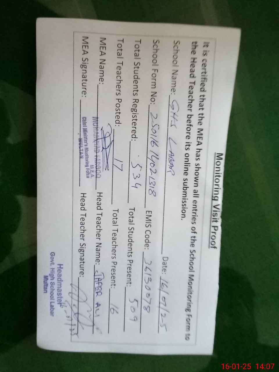 | Certified that this School was Inspected by the Undersigned MEA/DMO Today and the Information Stated Above is as Per Record. | |||||