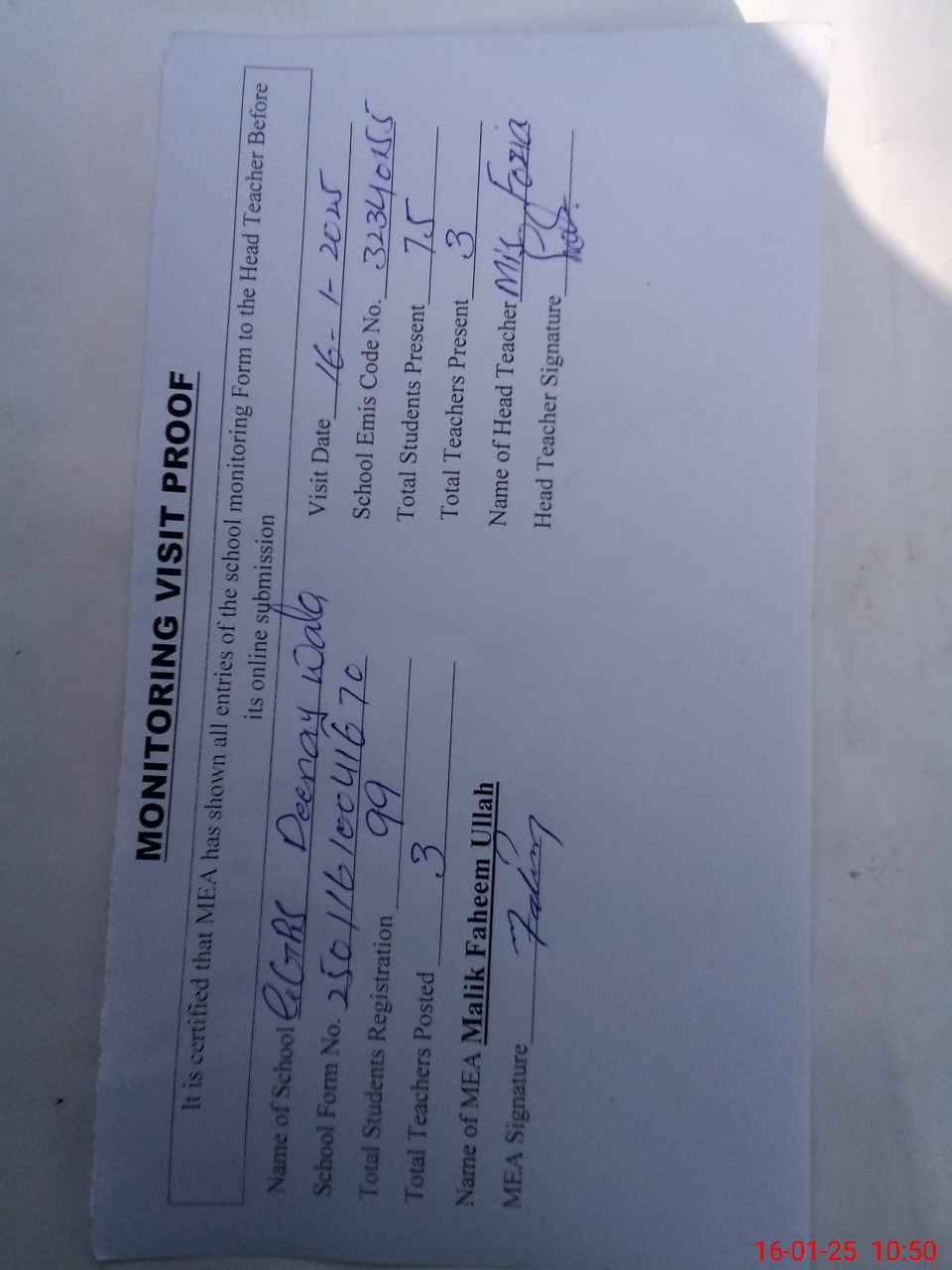 | Attendance Register | Head Teacher | MEA with School | Visit Proof |