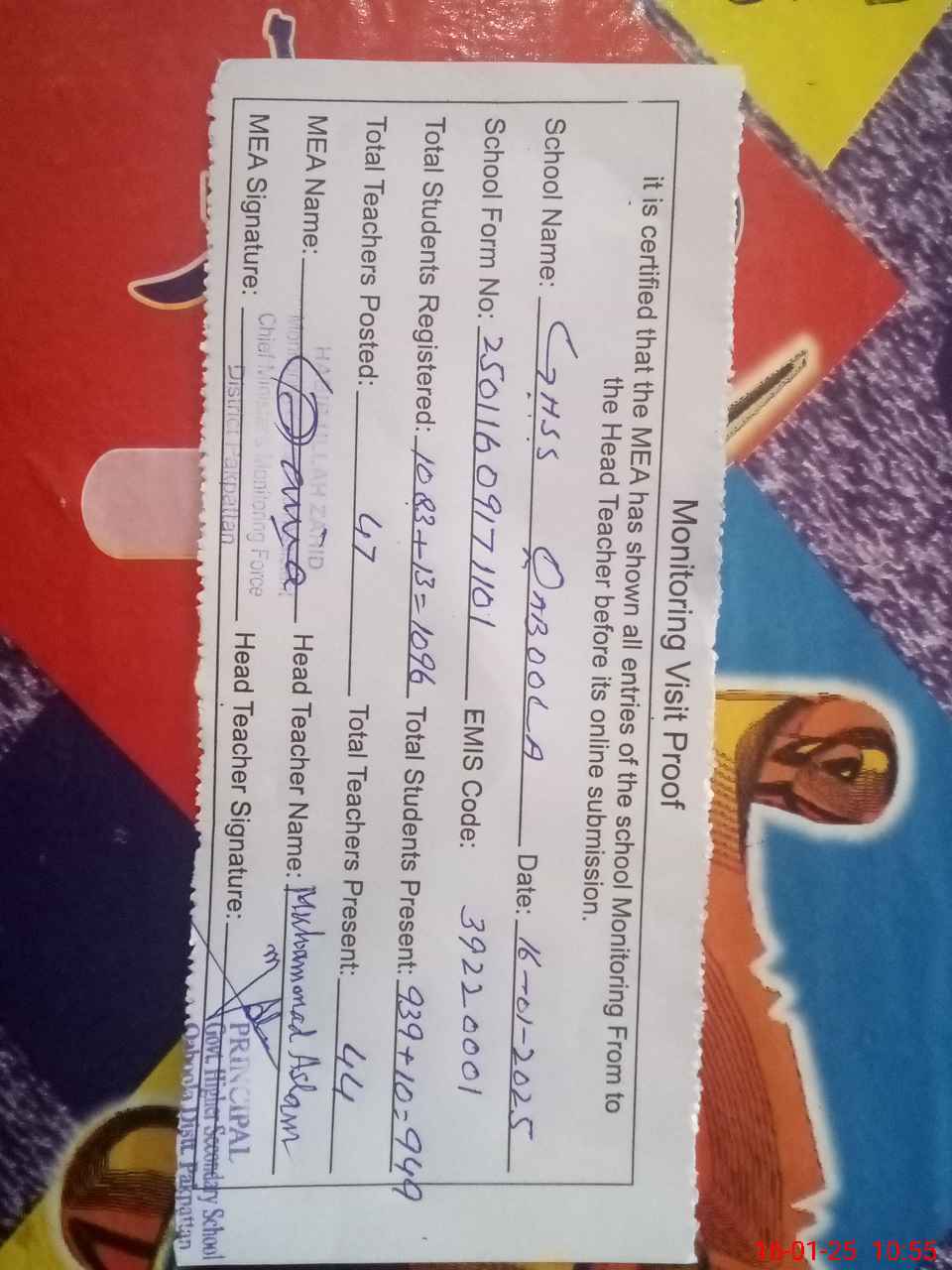 | Certified that this School was Inspected by the Undersigned MEA/DMO Today and the Information Stated Above is as Per Record. | |||||