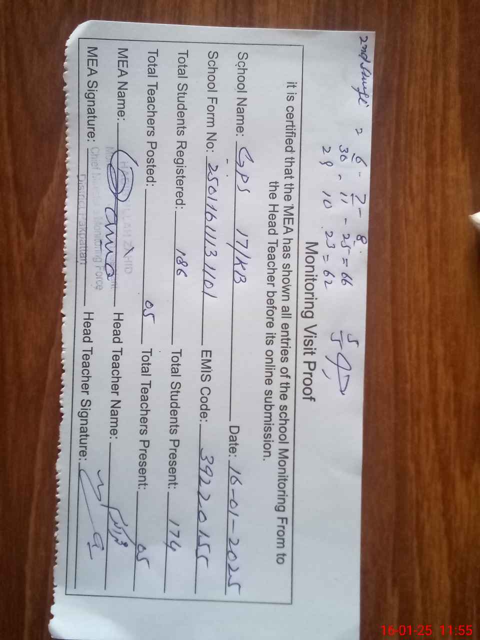 | EMIS Code: 39220155 | Name of School: GPS CHAK NO. 17 KB | |||