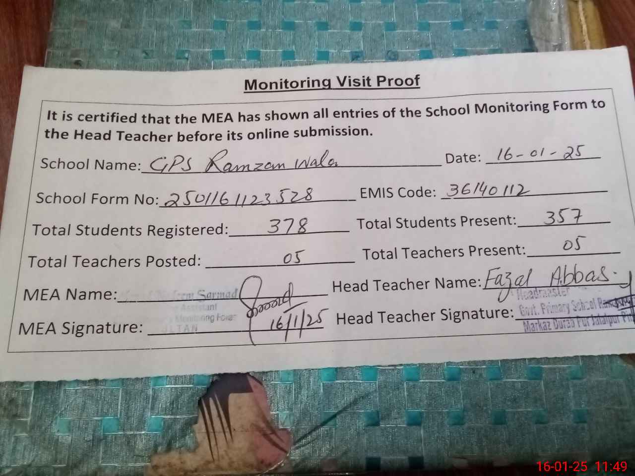 | Attendance Register | Head Teacher | MEA with School | Visit Proof |