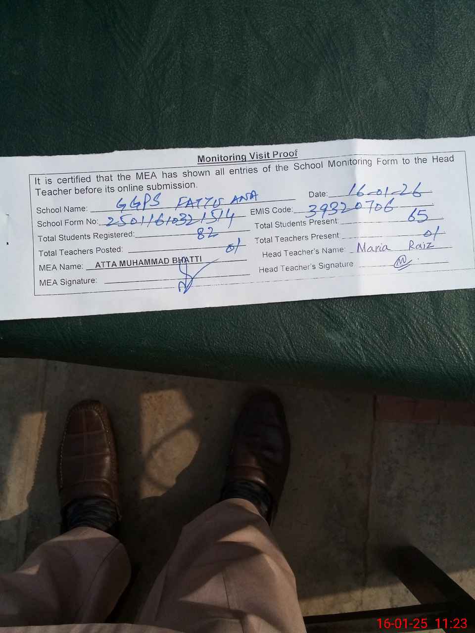 | Attendance Register | Head Teacher | MEA with School | Visit Proof |