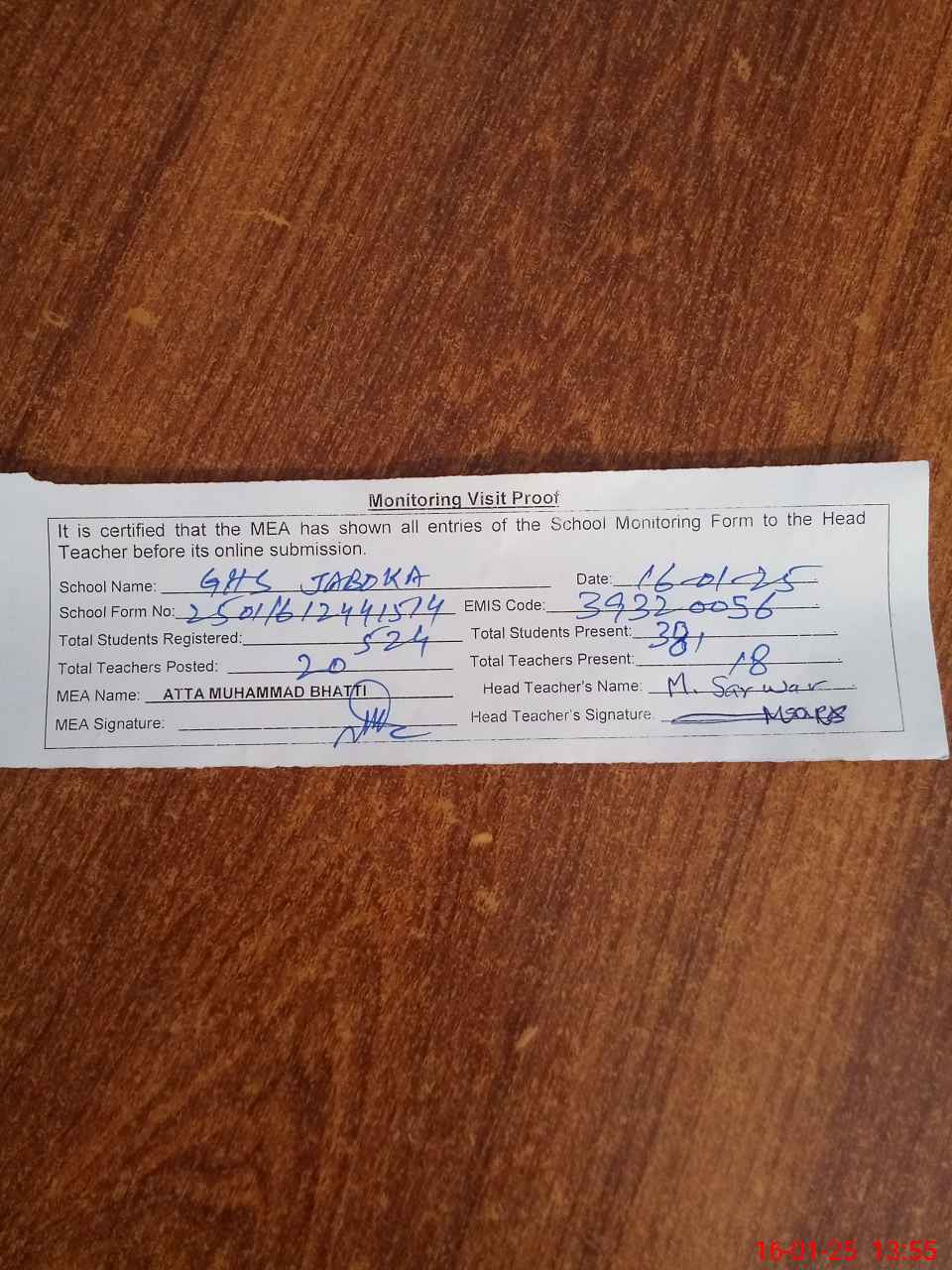 | Attendance Register | Head Teacher | MEA with School | Visit Proof |