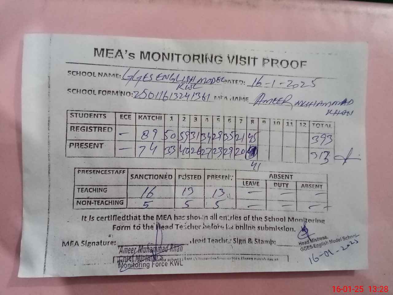 | Attendance Register | Head Teacher | MEA with School | Visit Proof |
