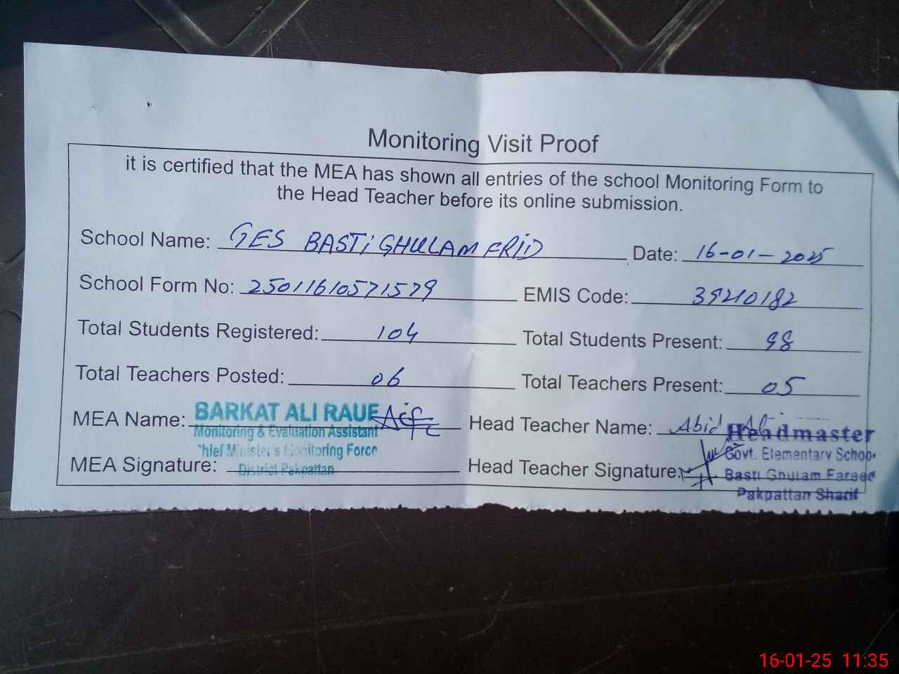 | EMIS Code: 39210182 | Name of School: GES BASTI GHULAM FARID | |||