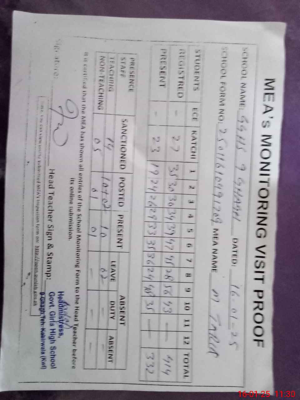 | Attendance Register | Head Teacher | MEA with School | Visit Proof |