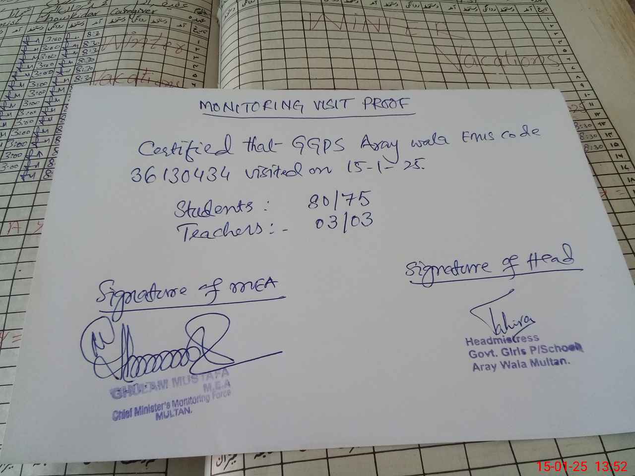 | Attendance Register | Head Teacher | MEA with School | Visit Proof |