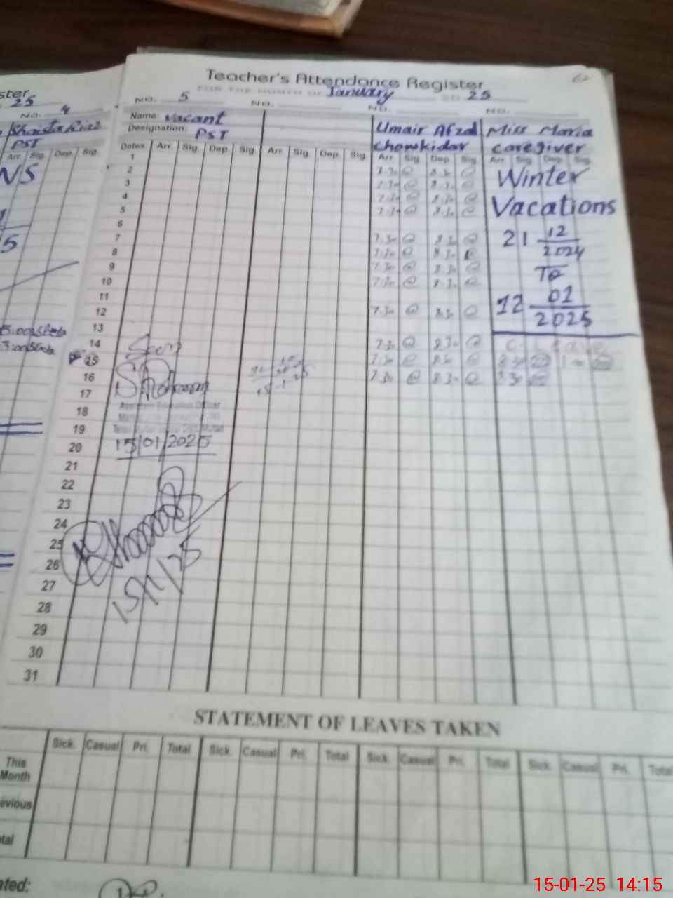 | CNIC | Full Name | Designation | R/C | Absence During Last Calender Month |