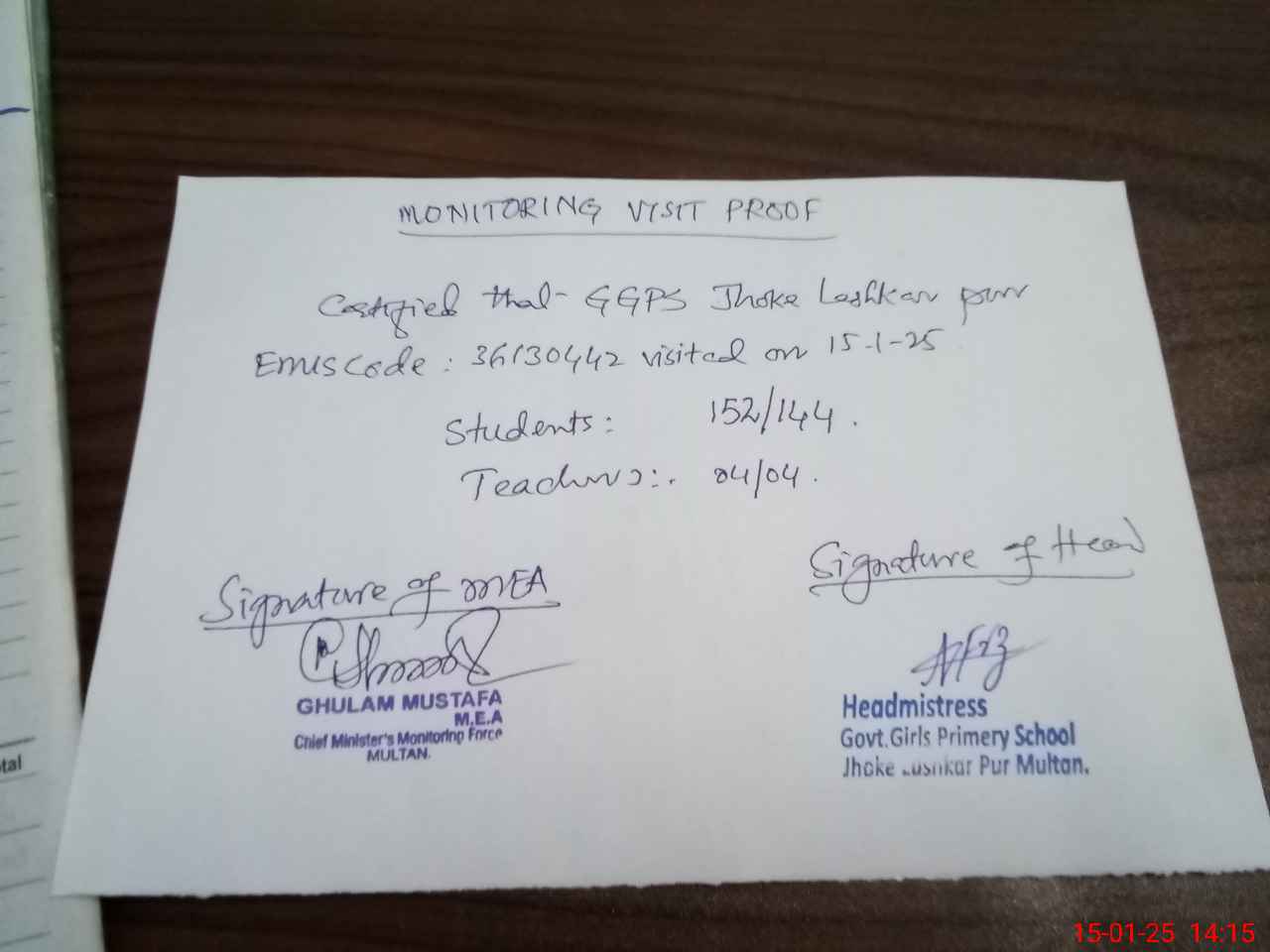 | Attendance Register | Head Teacher | MEA with School | Visit Proof |