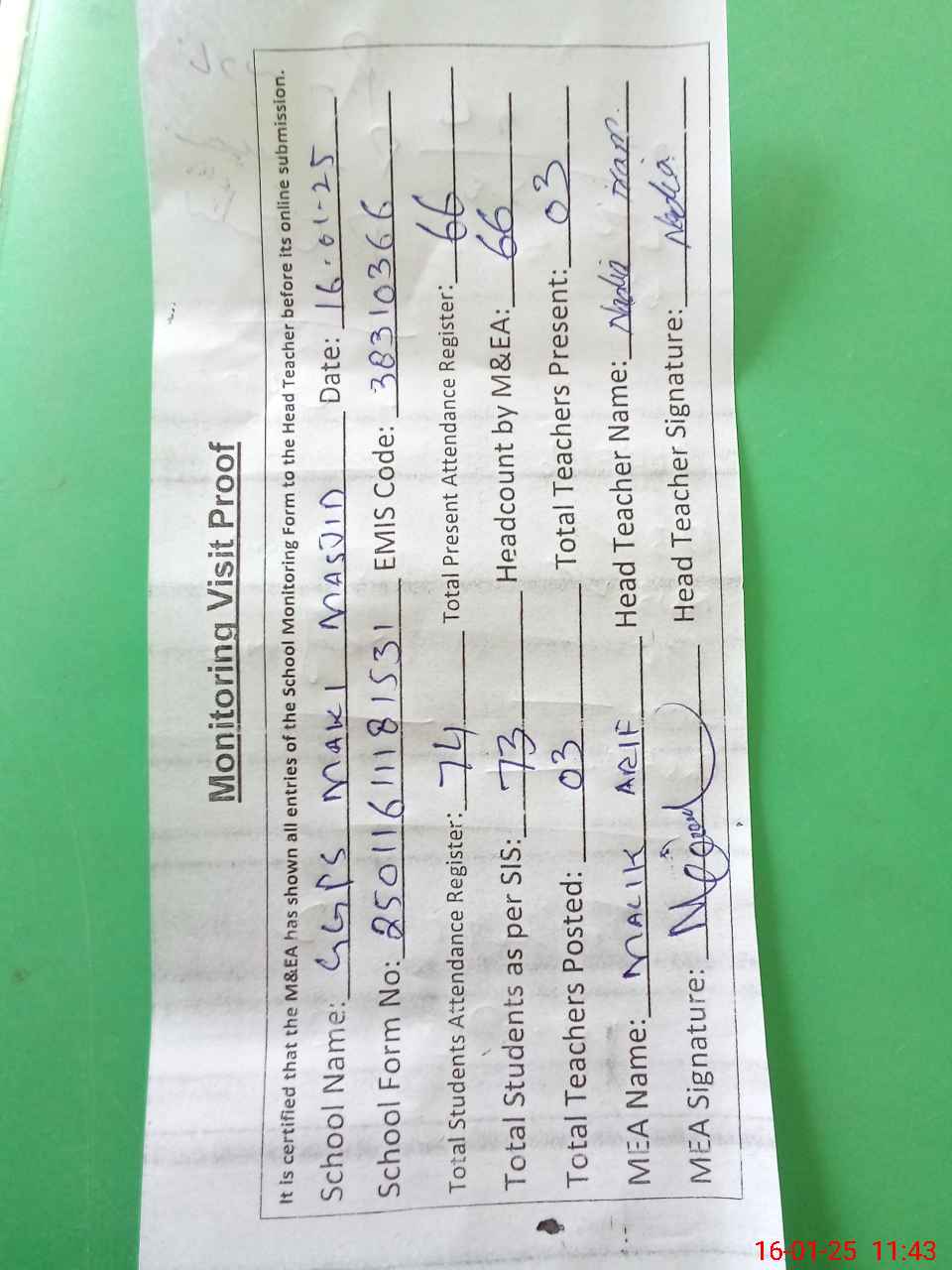 | Attendance Register | Head Teacher | MEA with School | Visit Proof |