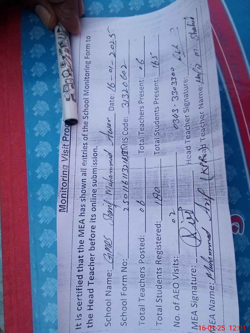 | Attendance Register | Head Teacher | MEA with School | Visit Proof |