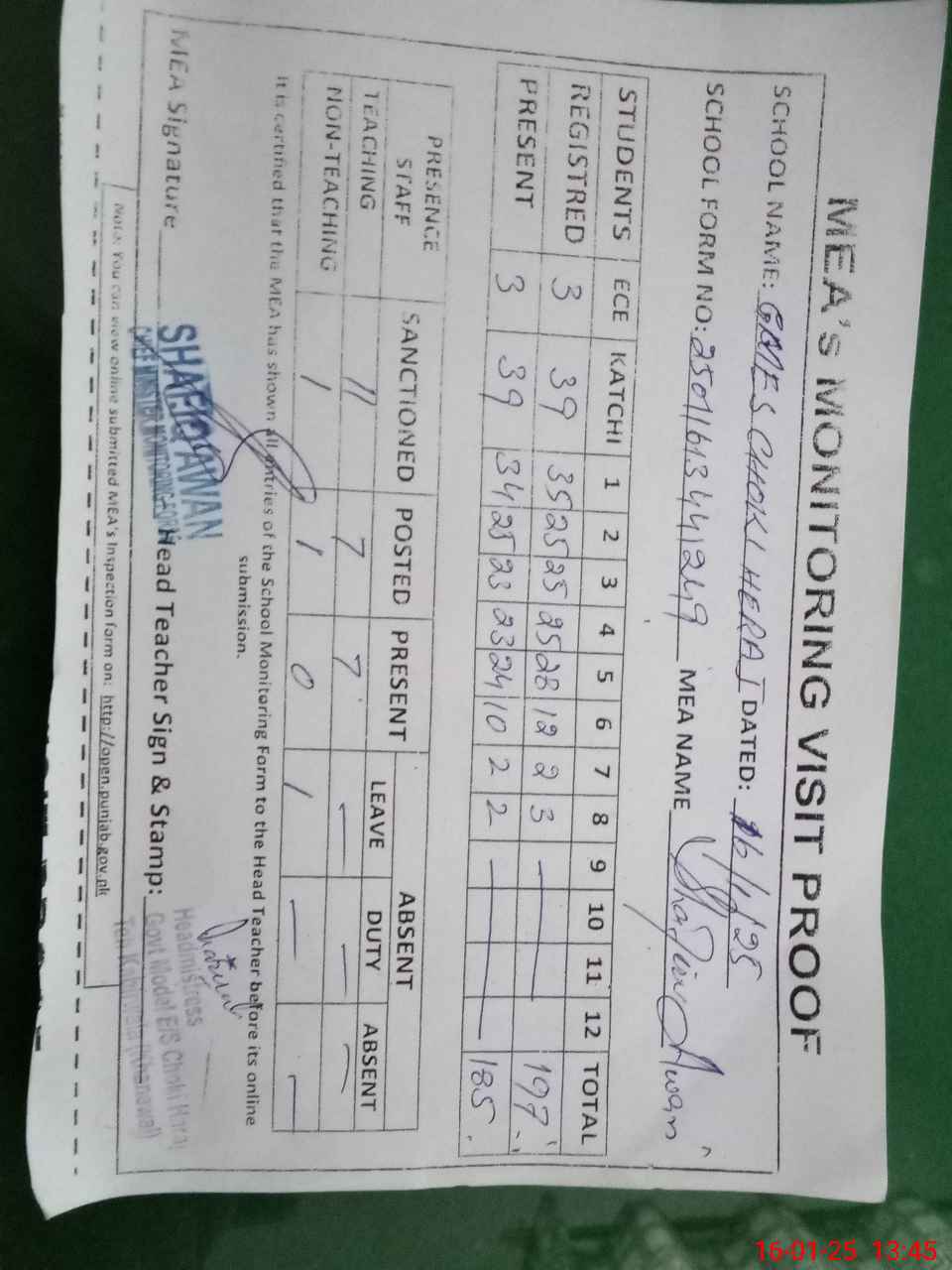 | Attendance Register | Head Teacher | MEA with School | Visit Proof |