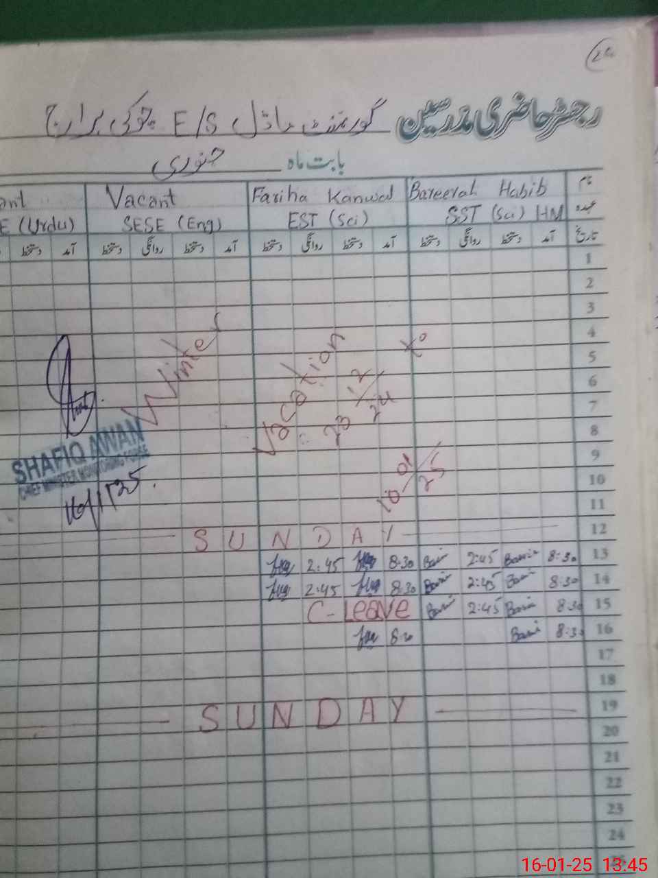 | CNIC | Full Name | Designation | R/C | Absence During Last Calender Month |