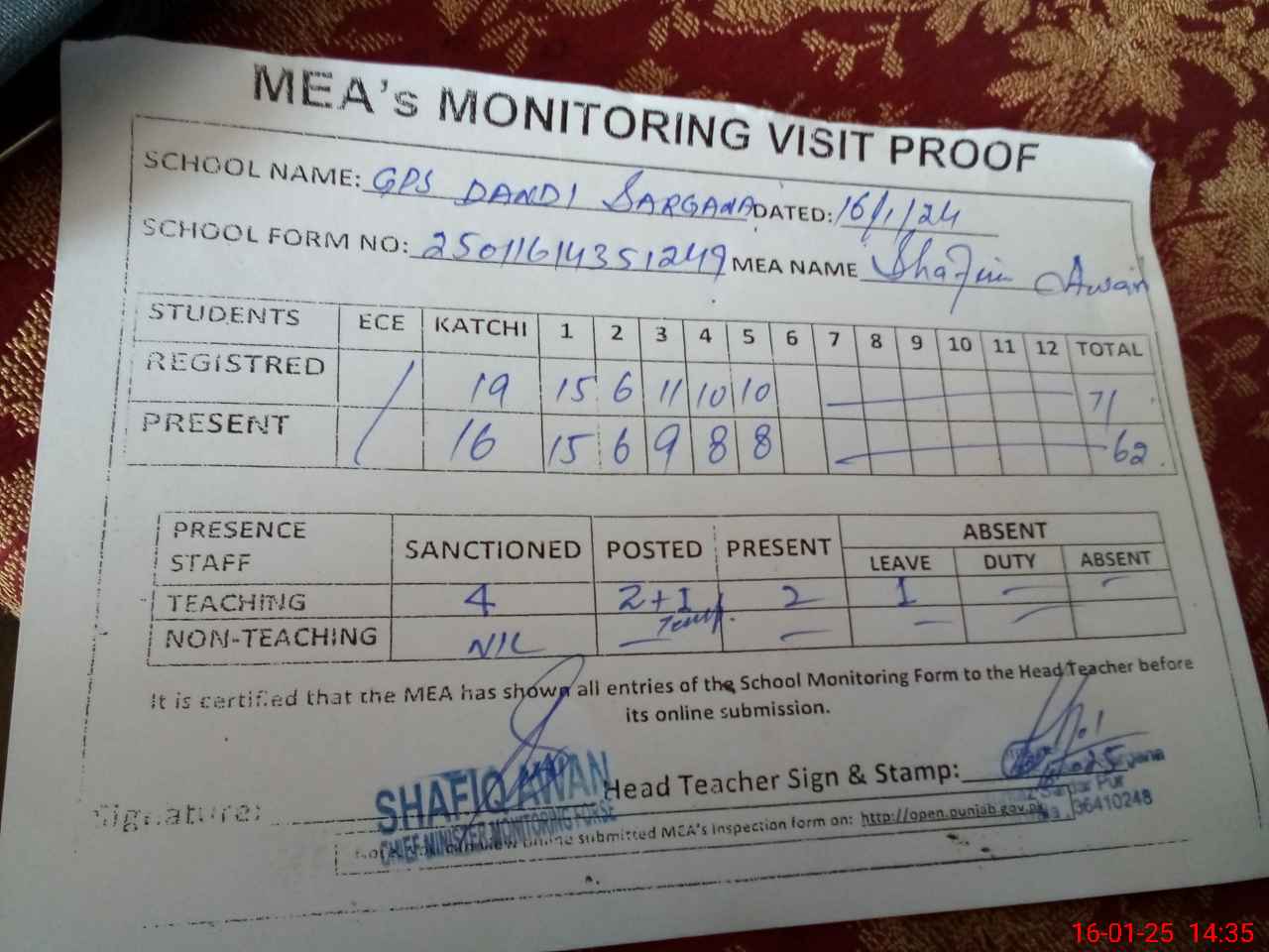 | Attendance Register | Head Teacher | MEA with School | Visit Proof |