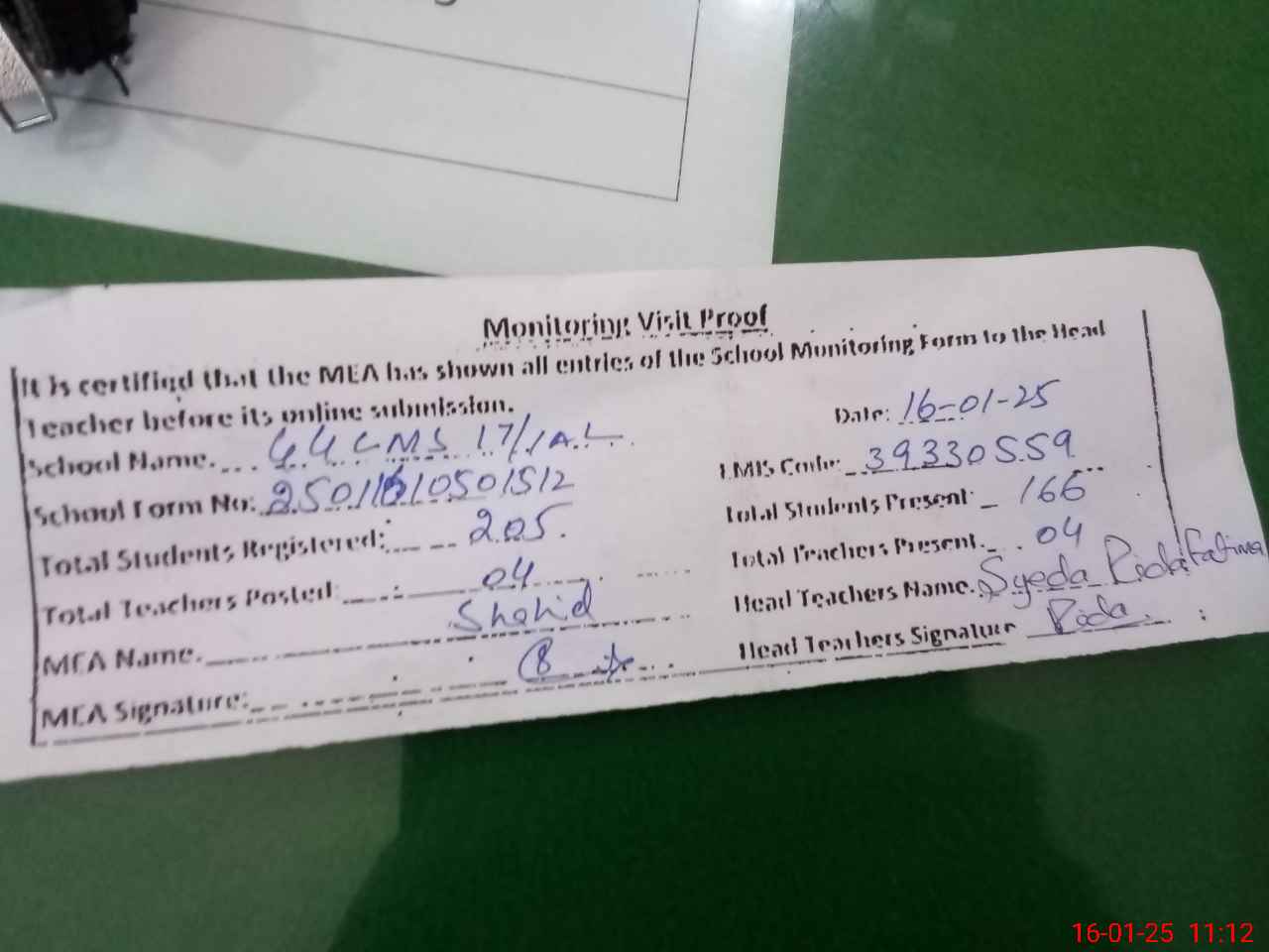 | Attendance Register | Head Teacher | MEA with School | Visit Proof |