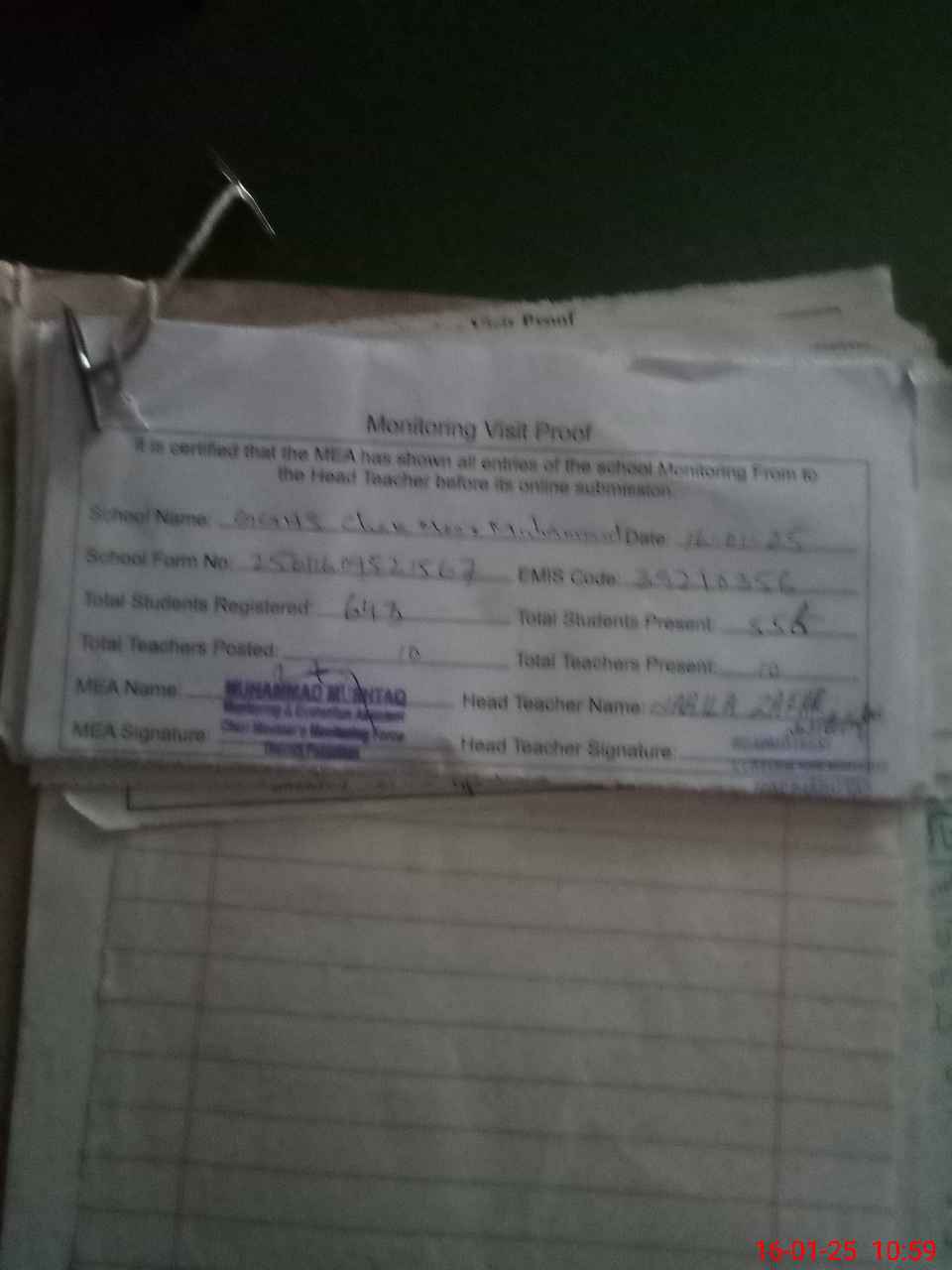 | Attendance Register | Head Teacher | MEA with School | Visit Proof |