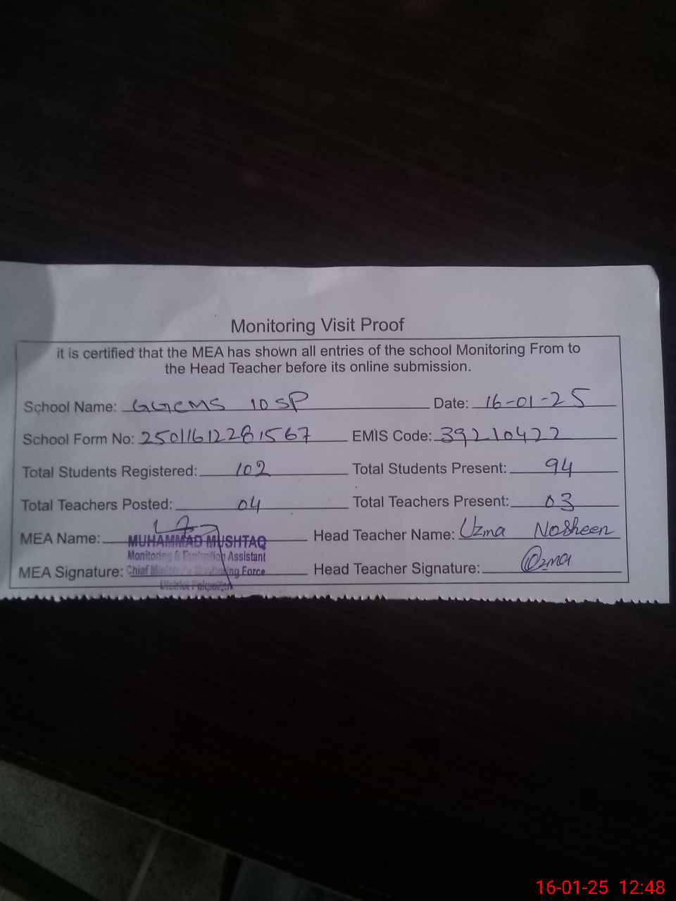 | Attendance Register | Head Teacher | MEA with School | Visit Proof |