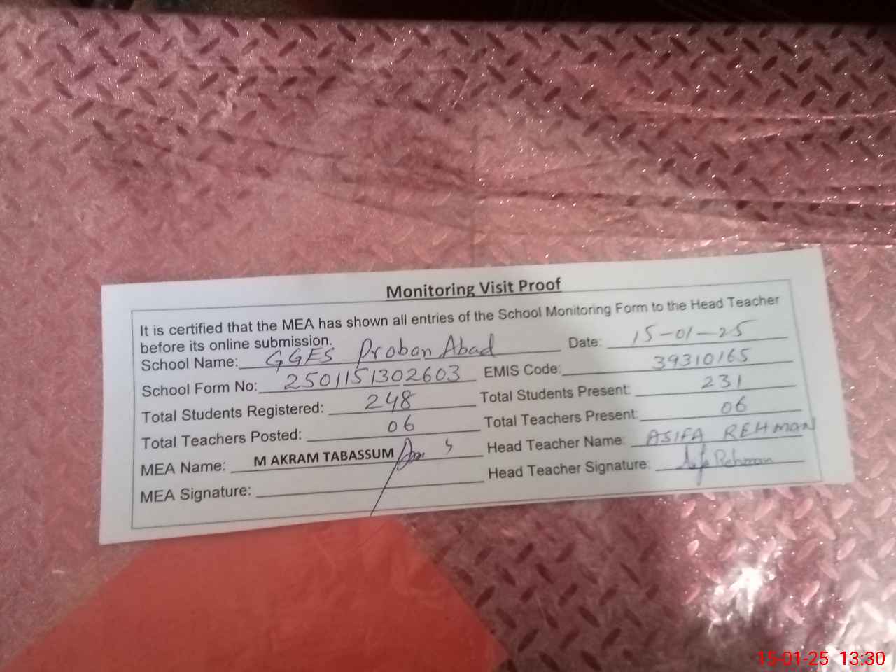 | Attendance Register | Head Teacher | MEA with School | Visit Proof |