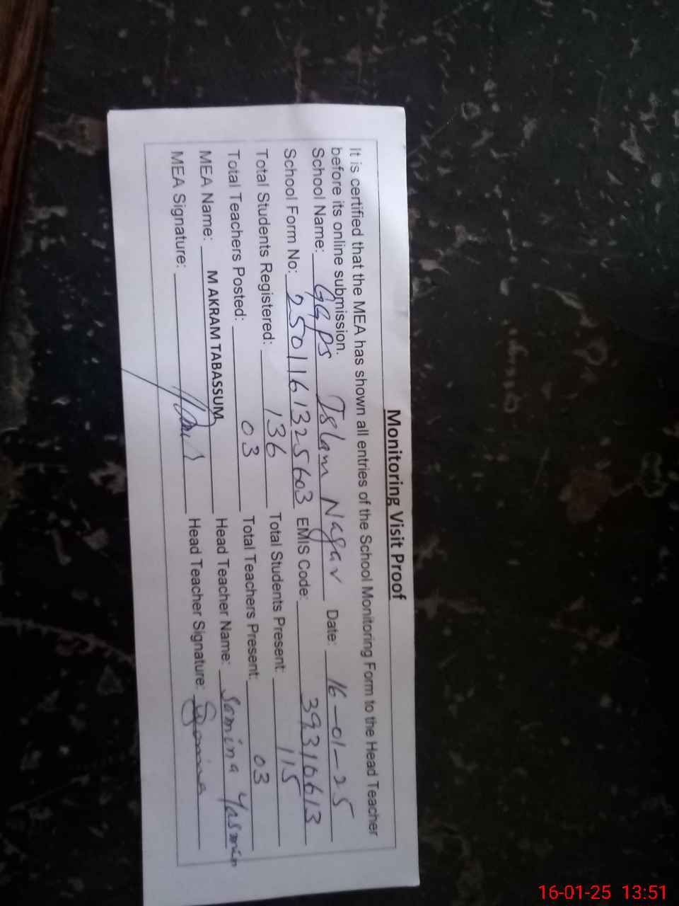 | Attendance Register | Head Teacher | MEA with School | Visit Proof |