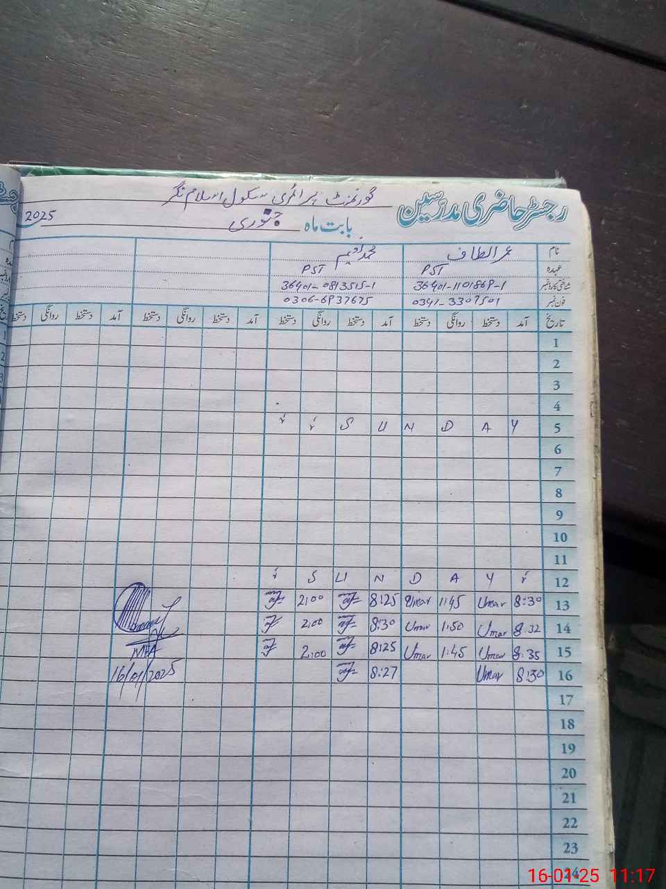 | Name: UM**** AL**** Designation: (School Headmaster's/Headmistress's) PST Phone/Cell Number: 03**** |
