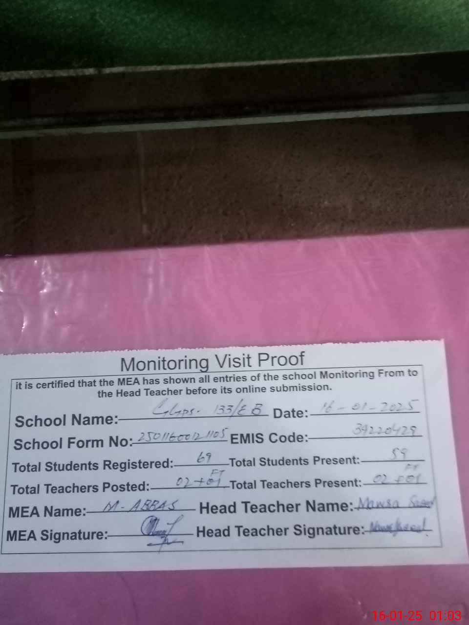 | Attendance Register | Head Teacher | MEA with School | Visit Proof |