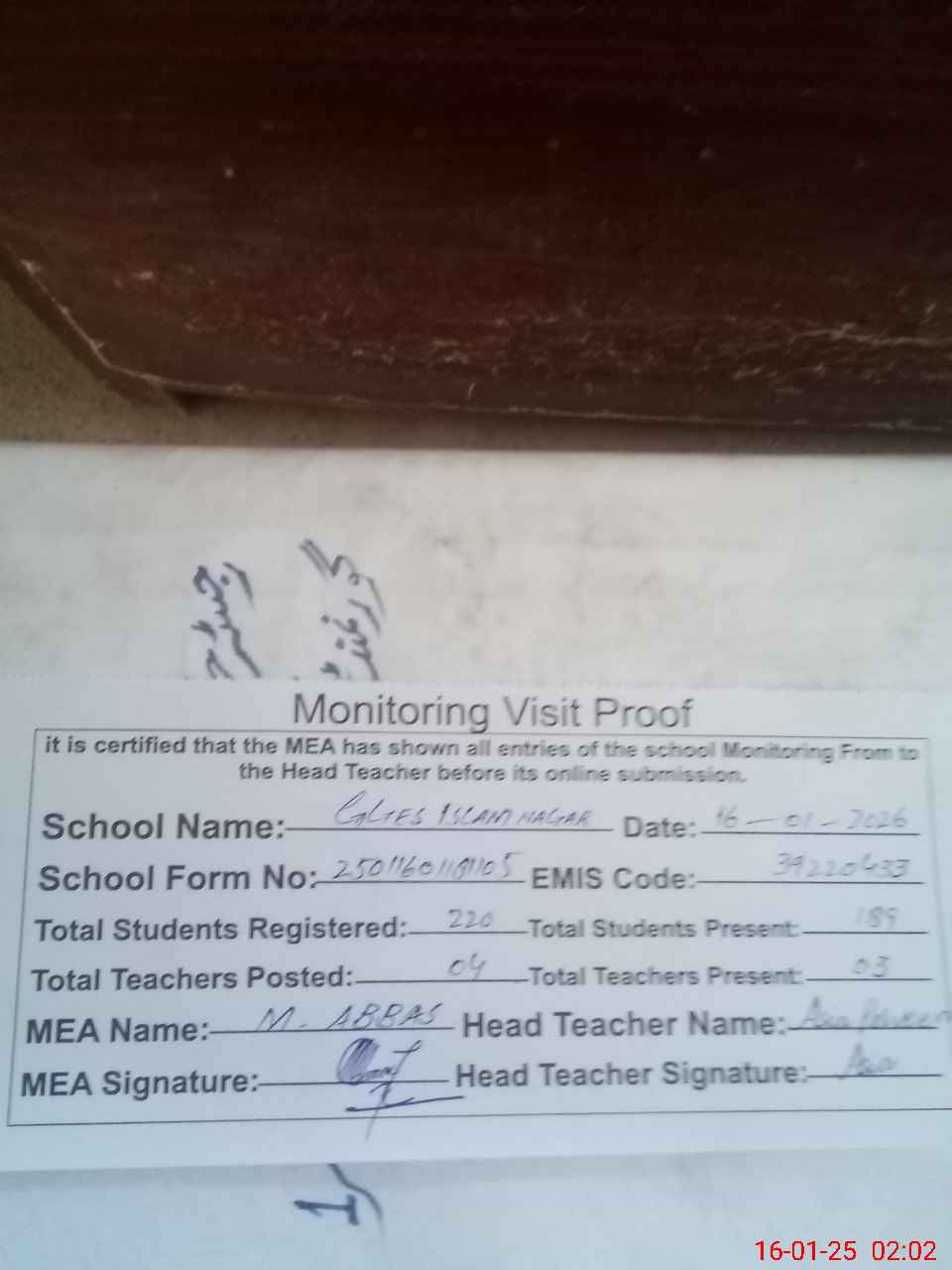 | Attendance Register | Head Teacher | MEA with School | Visit Proof |