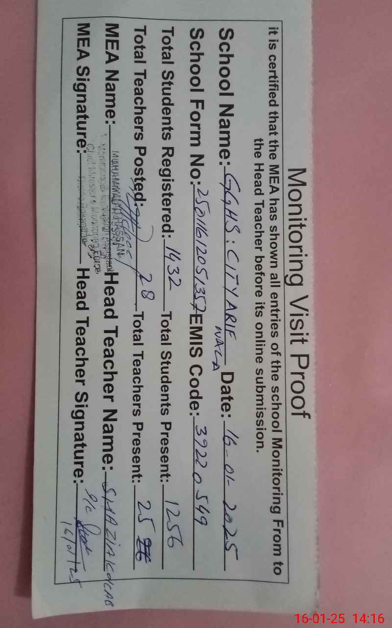 | EMIS Code: 39220549 | Name of School: GGHS CITY ARIFWALA | |||