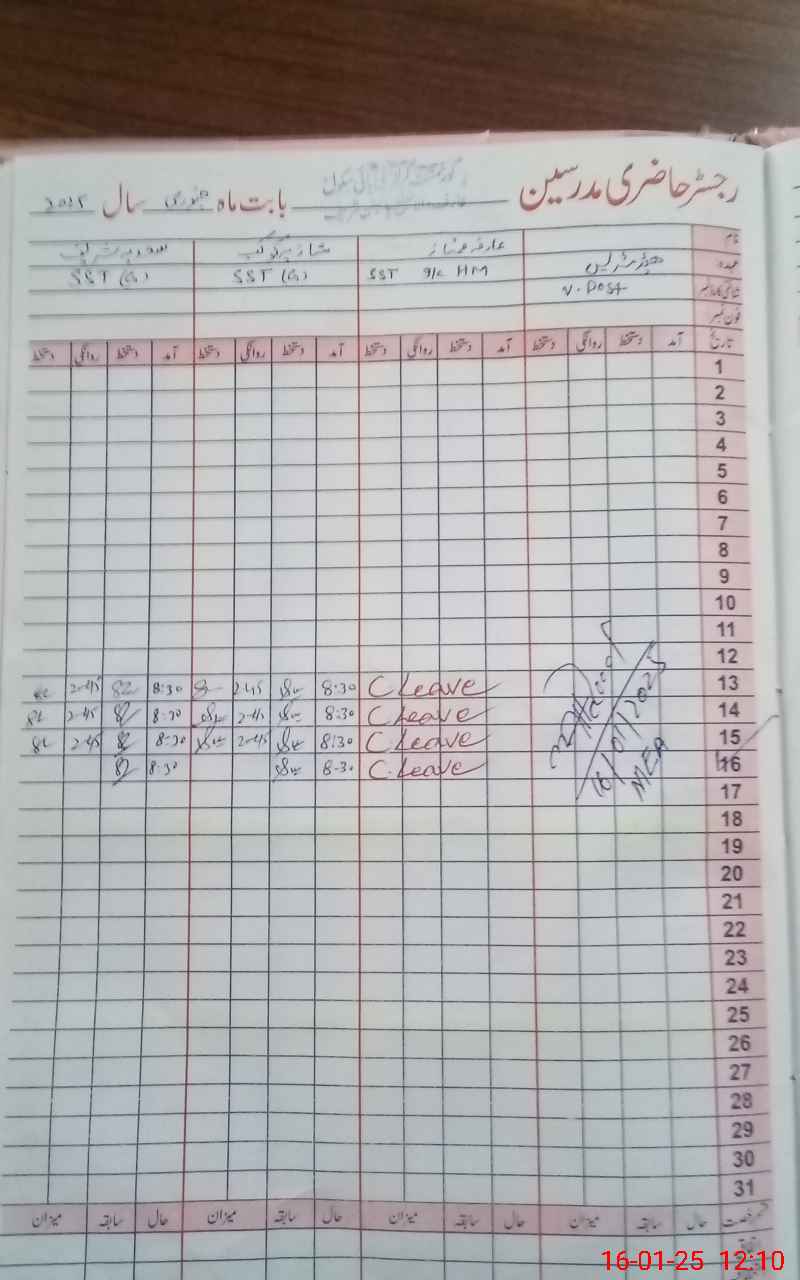 | CNIC | Full Name | Designation | R/C | Absence During Last Calender Month |