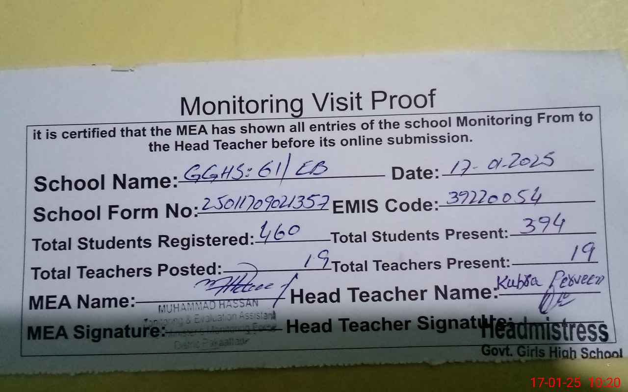 | EMIS Code: 39220054 | Name of School: GGHS 61 EB | |||