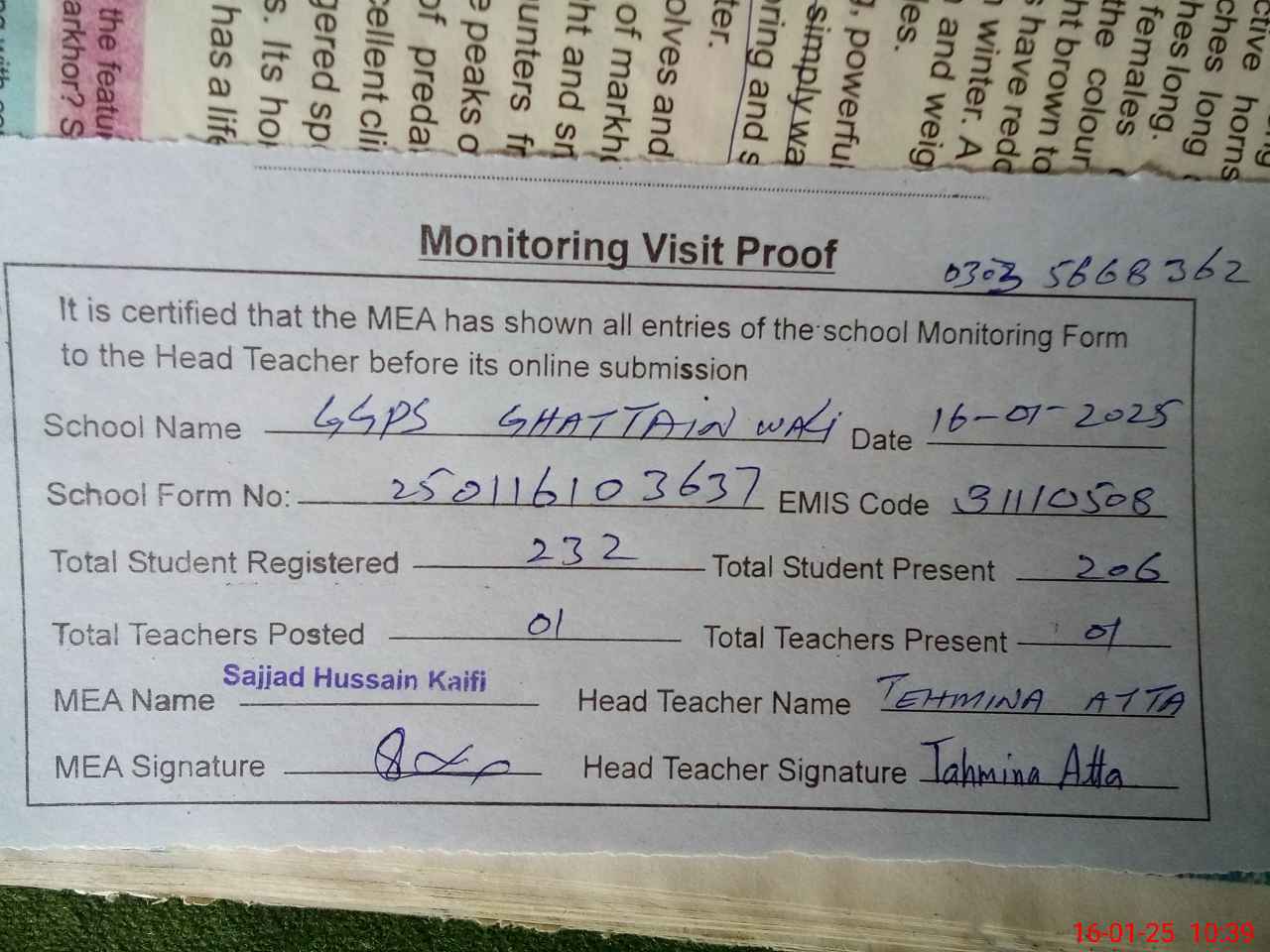 | EMIS Code: 31110508 | Name of School: GGPS GHATTIAN WALI | |||