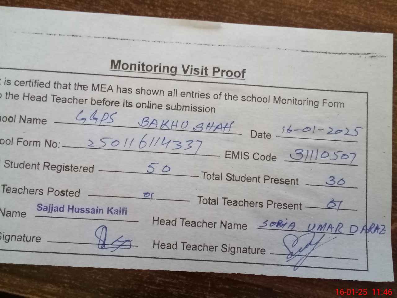 | Attendance Register | Head Teacher | MEA with School | Visit Proof |