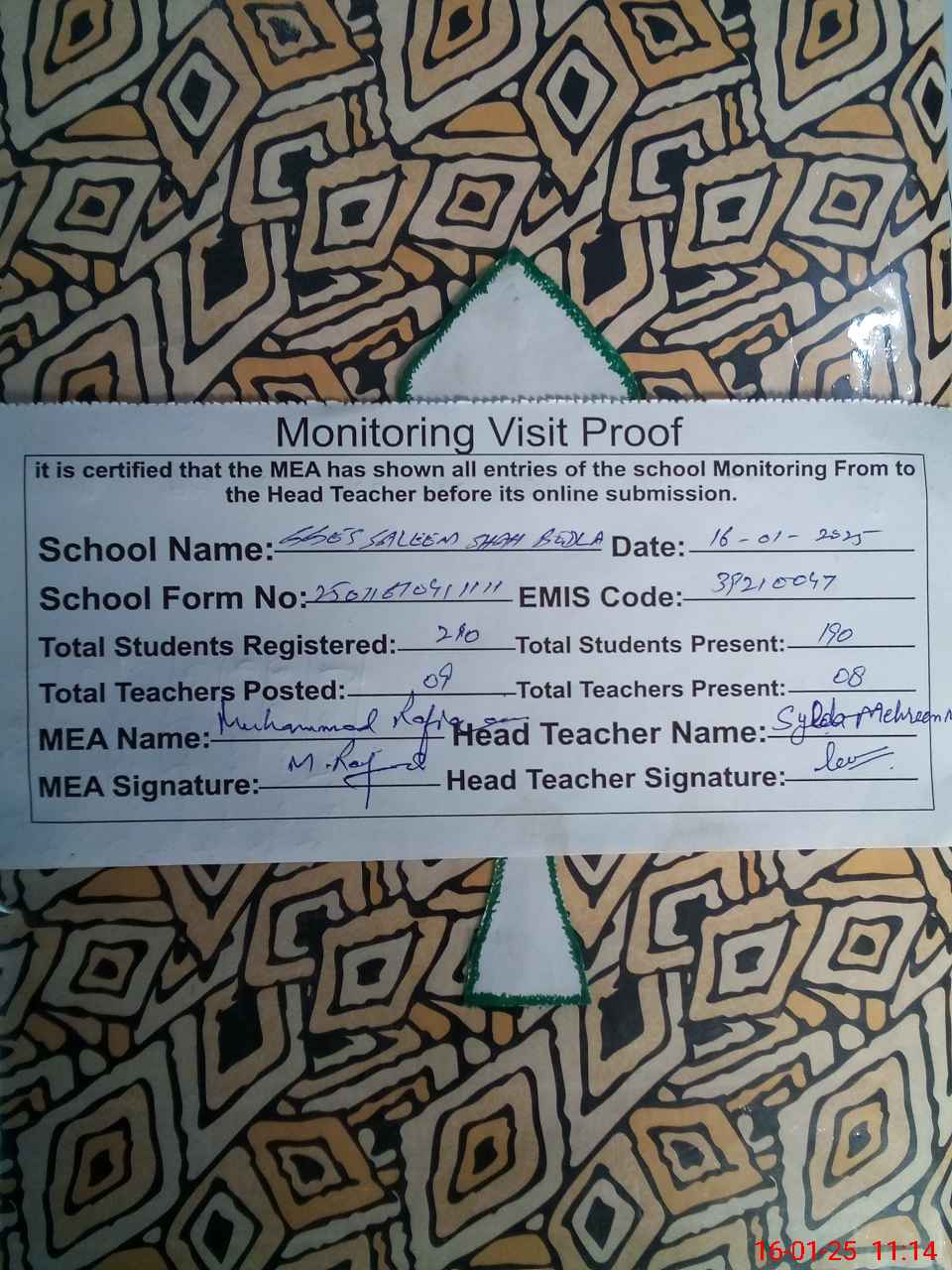 | Attendance Register | Head Teacher | MEA with School | Visit Proof |