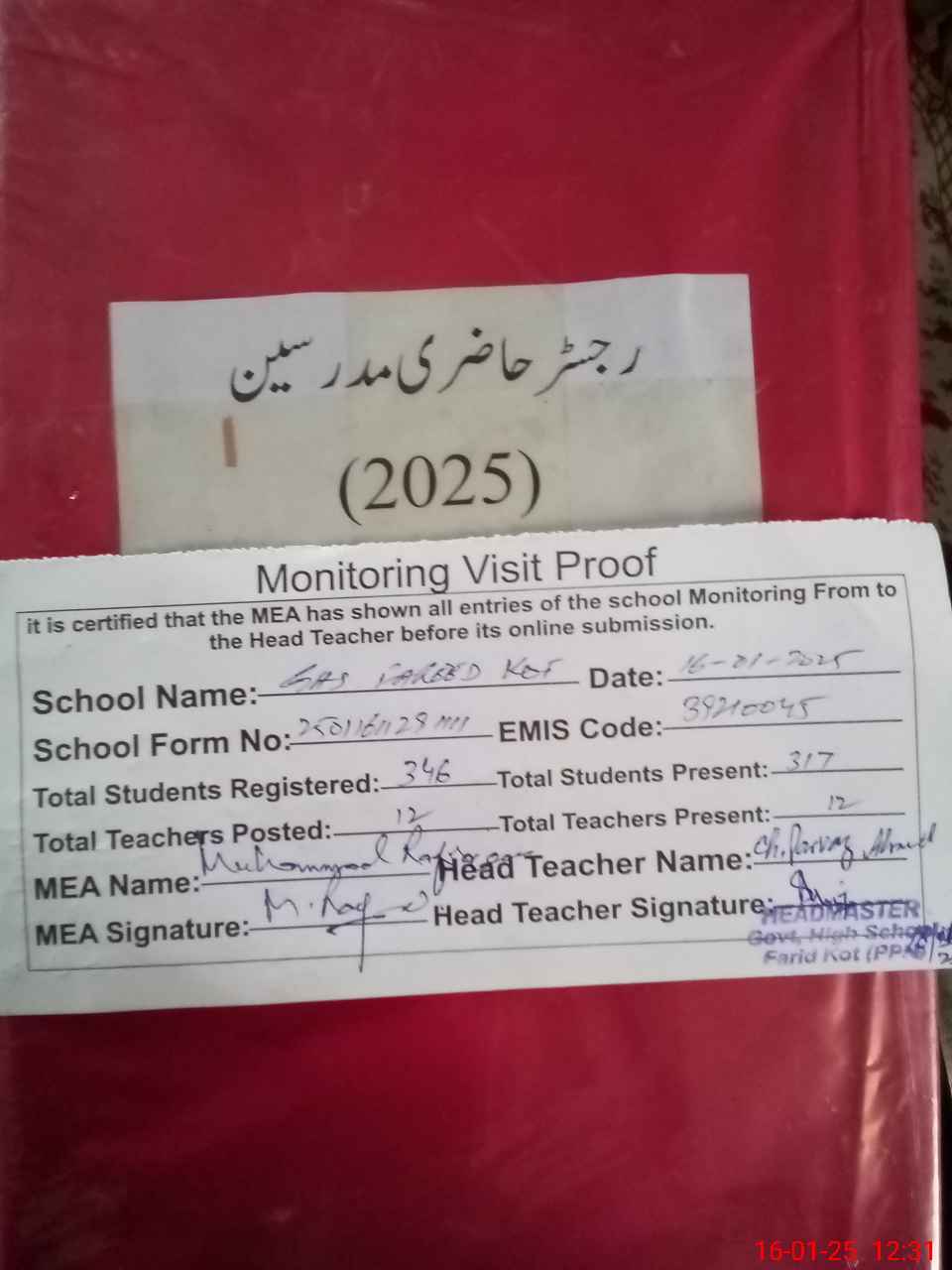 | EMIS Code: 39210045 | Name of School: GHS FARID KOT P/O PAKPATTAN | |||