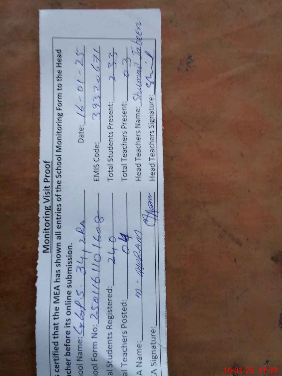| Attendance Register | Head Teacher | MEA with School | Visit Proof |