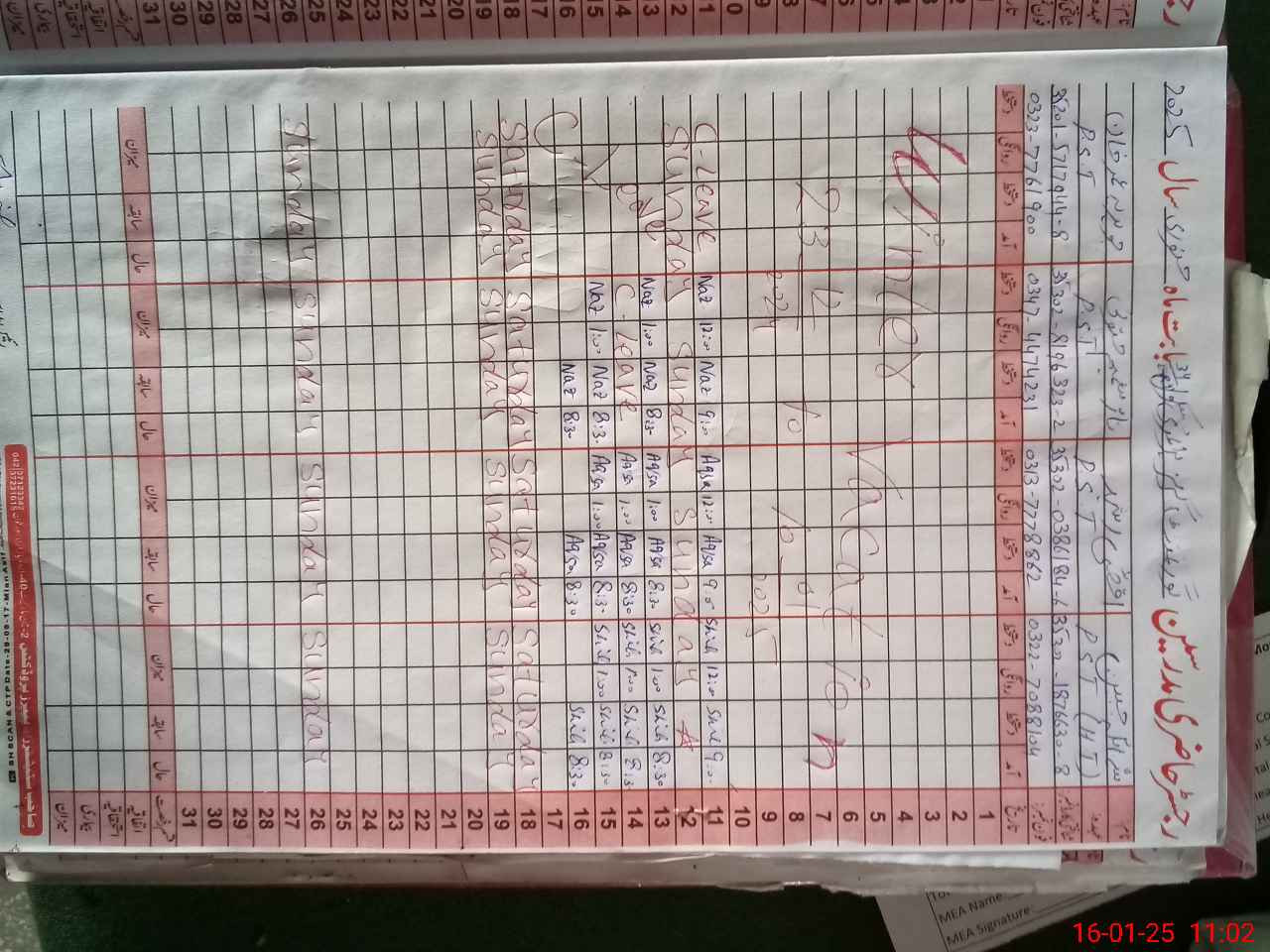 | CNIC | Full Name | Designation | R/C | Absence During Last Calender Month |
