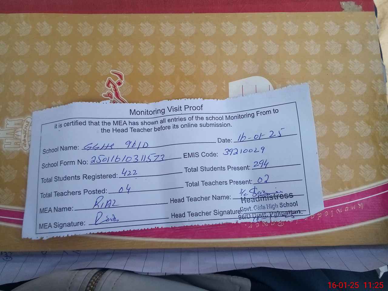 | Attendance Register | Head Teacher | MEA with School | Visit Proof |