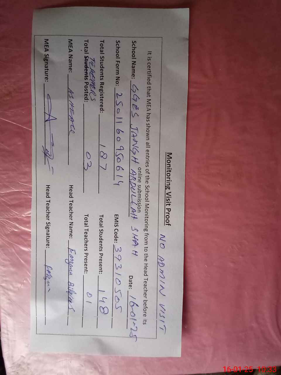 | Attendance Register | Head Teacher | MEA with School | Visit Proof |