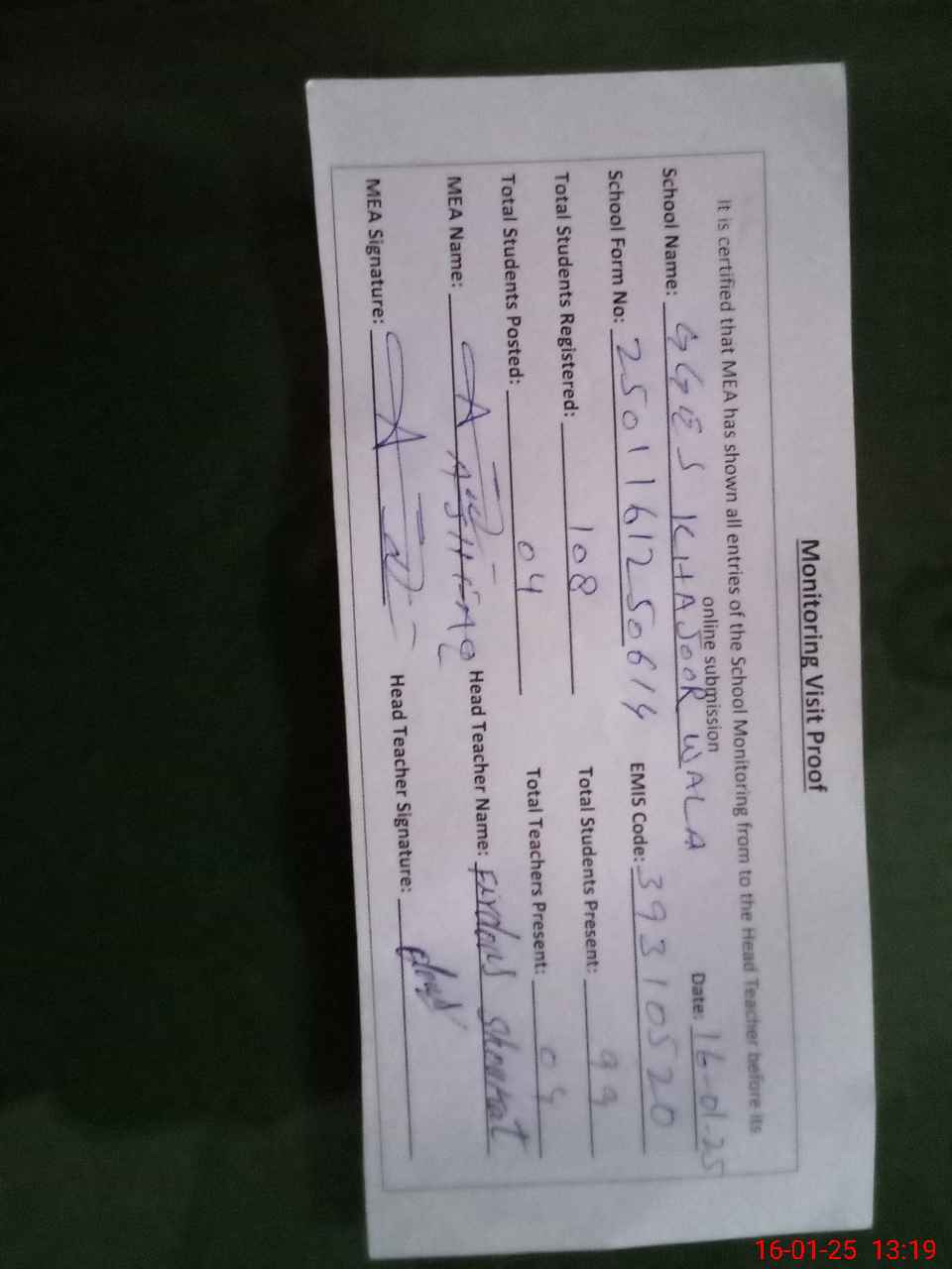 | Attendance Register | Head Teacher | MEA with School | Visit Proof |