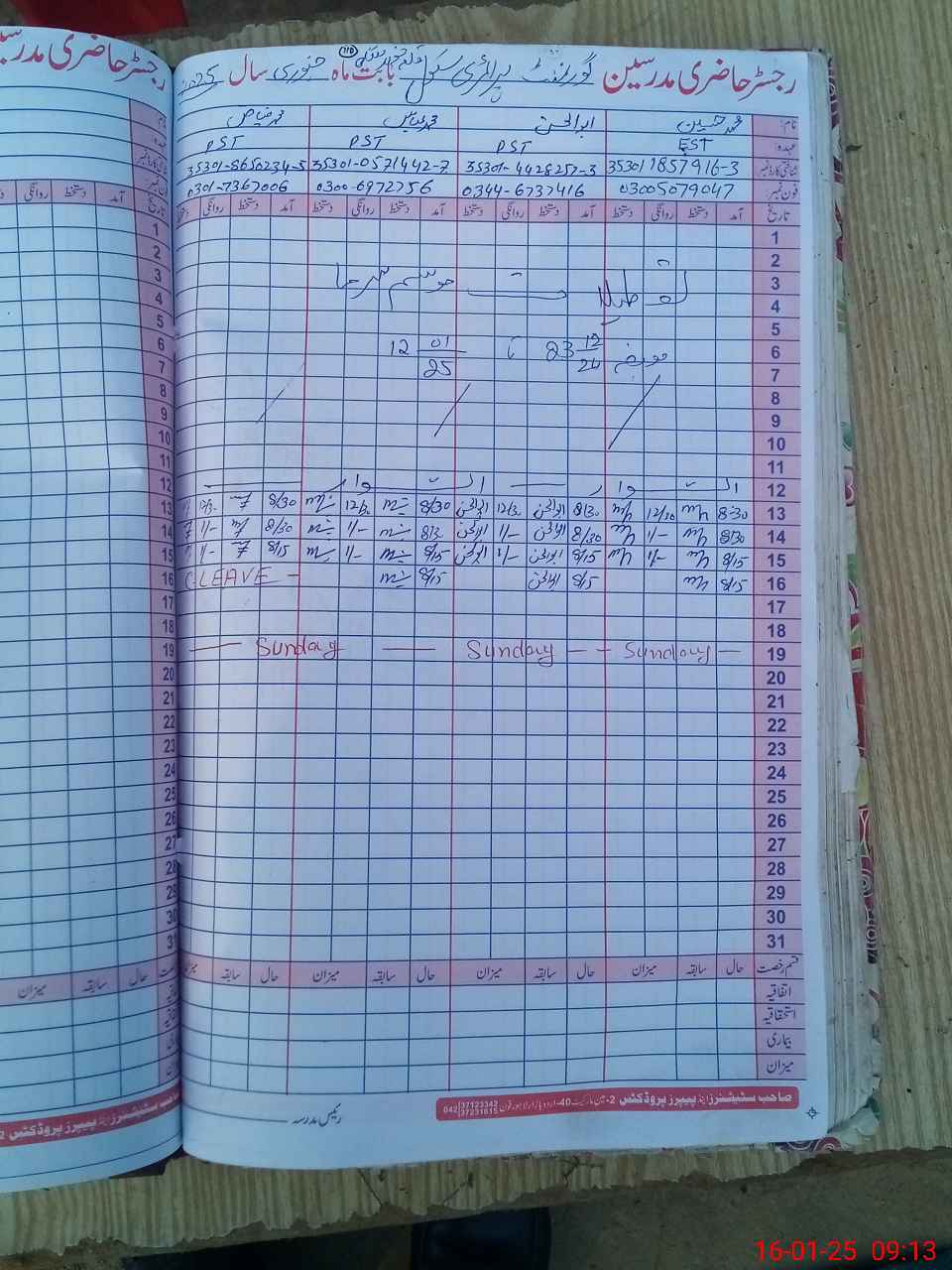 | CNIC | Full Name | Designation | R/C | Absence During Last Calender Month |