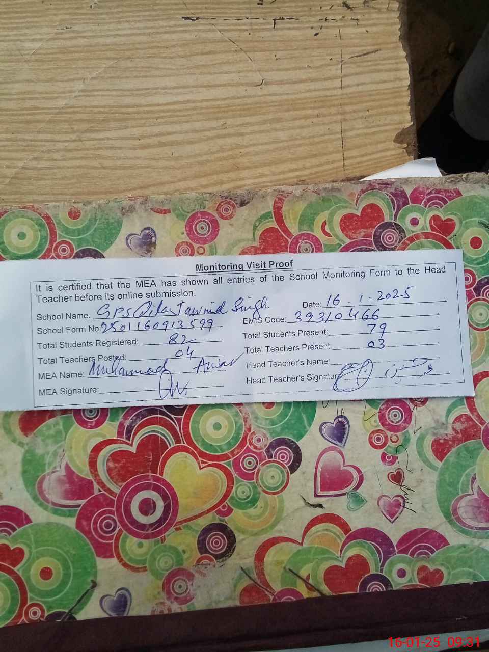 | Attendance Register | Head Teacher | MEA with School | Visit Proof |