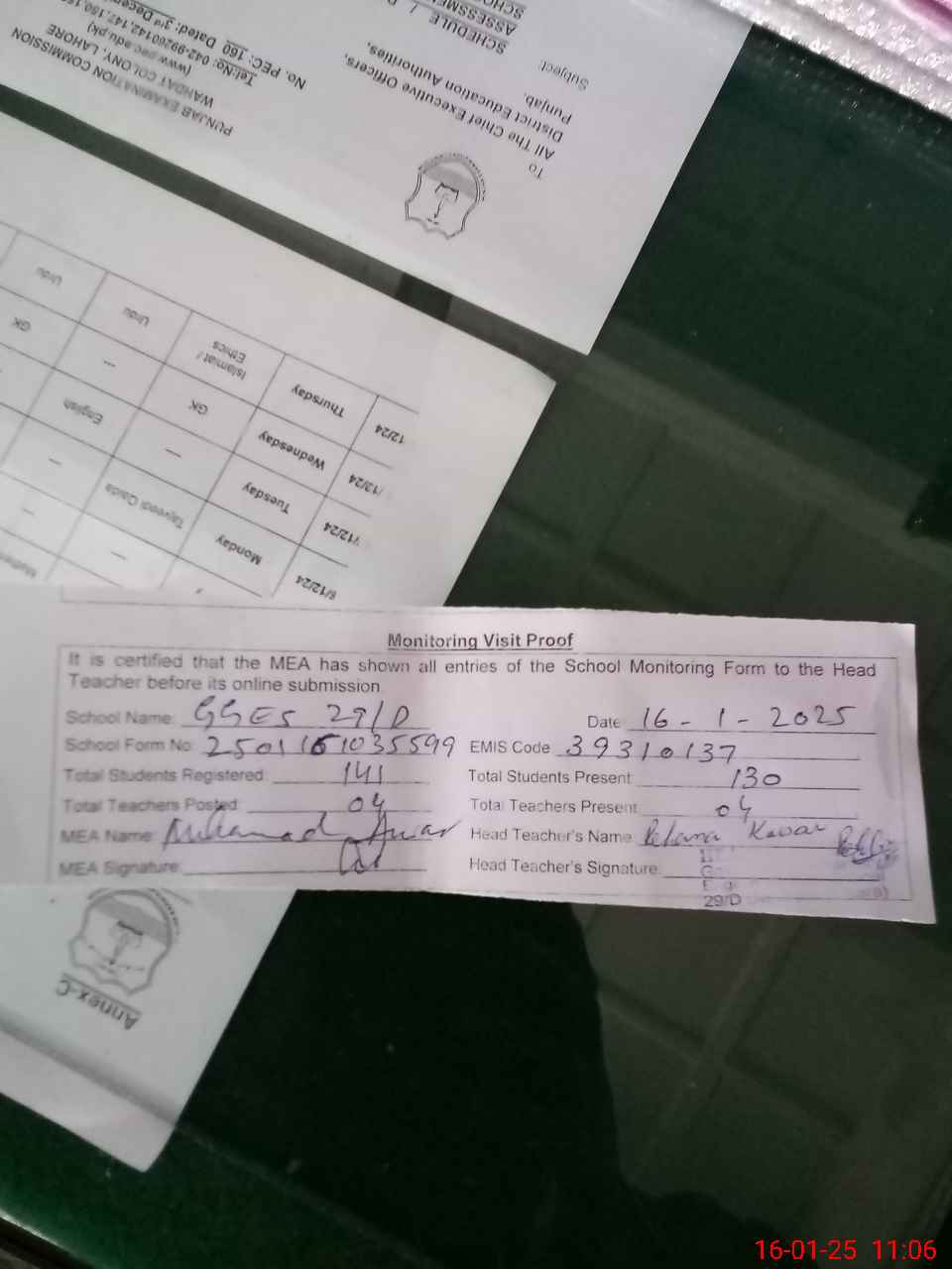 | Attendance Register | Head Teacher | MEA with School | Visit Proof |