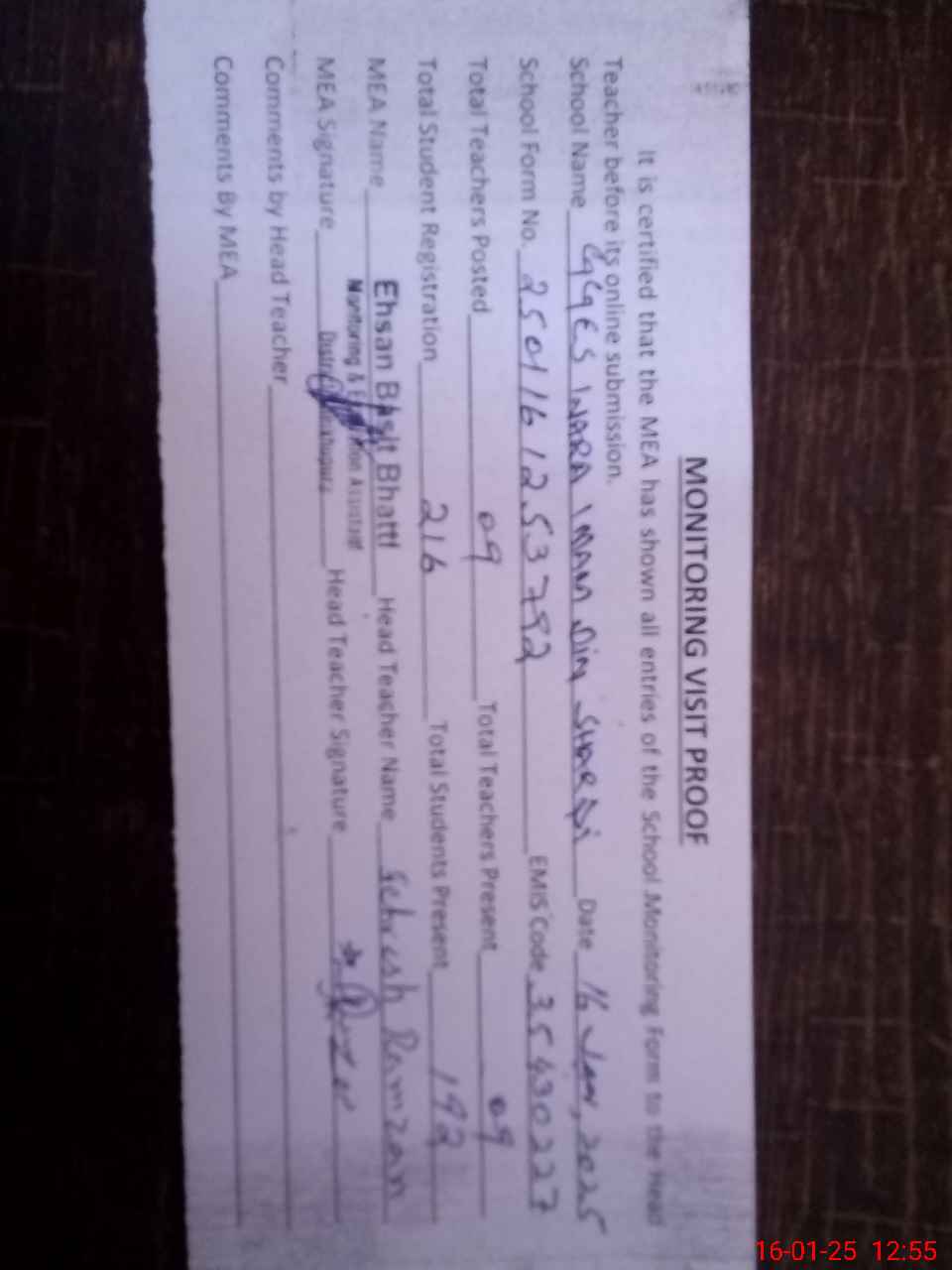 | Certified that this School was Inspected by the Undersigned MEA/DMO Today and the Information Stated Above is as Per Record. | |||||