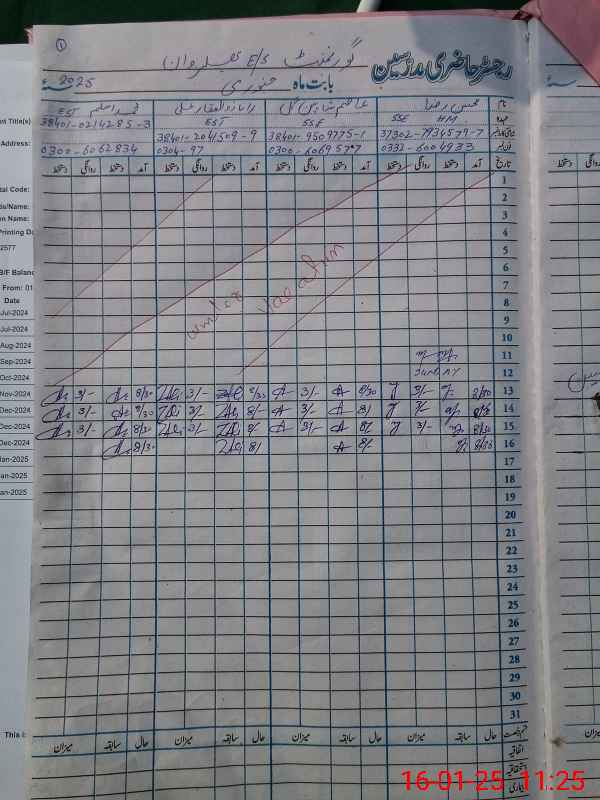 | CNIC | Full Name | Designation | R/C | Absence During Last Calender Month |