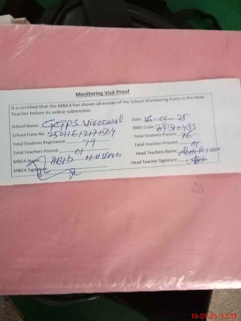 | Attendance Register | Head Teacher | MEA with School | Visit Proof |