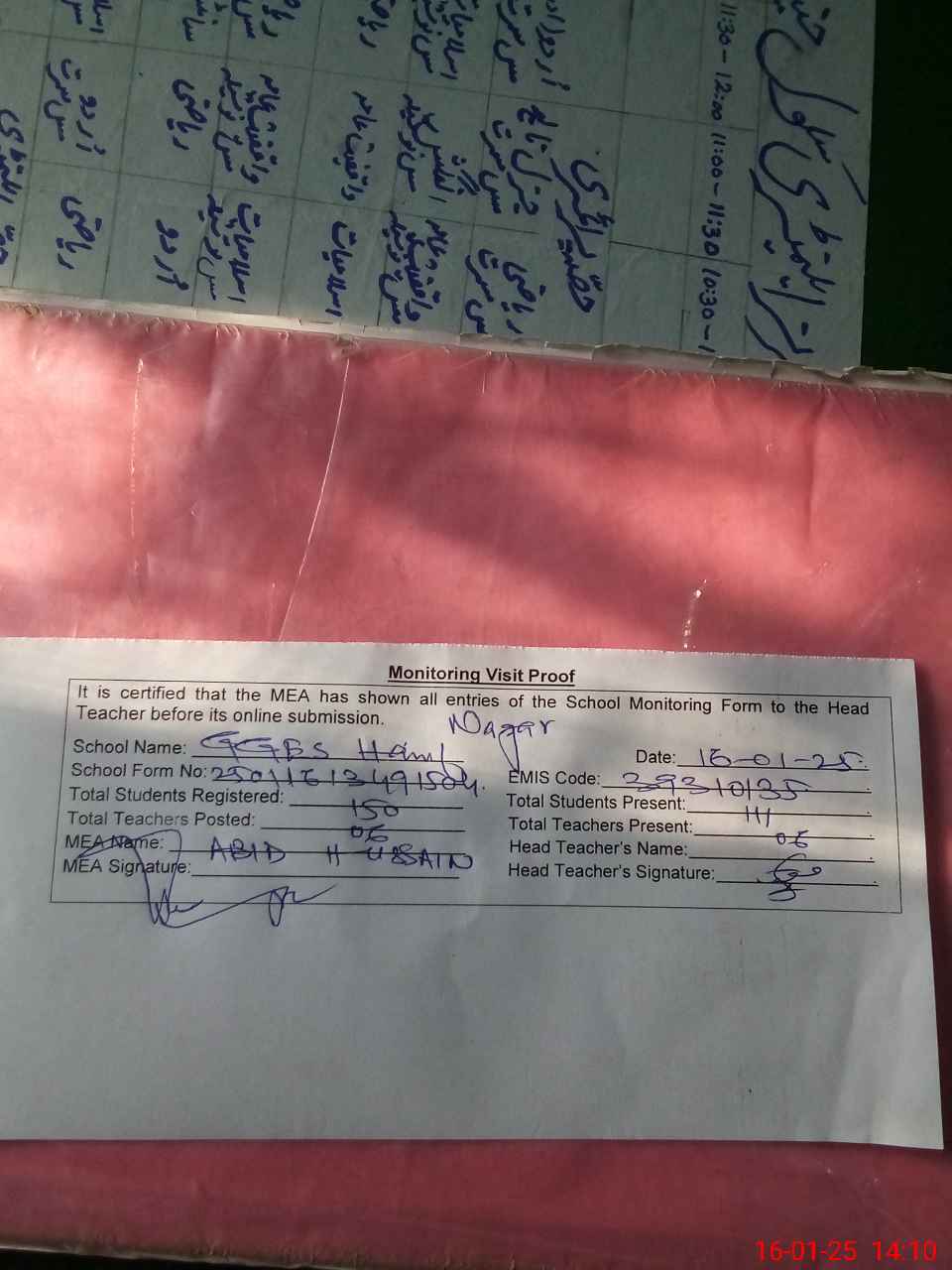 | Certified that this School was Inspected by the Undersigned MEA/DMO Today and the Information Stated Above is as Per Record. | |||||