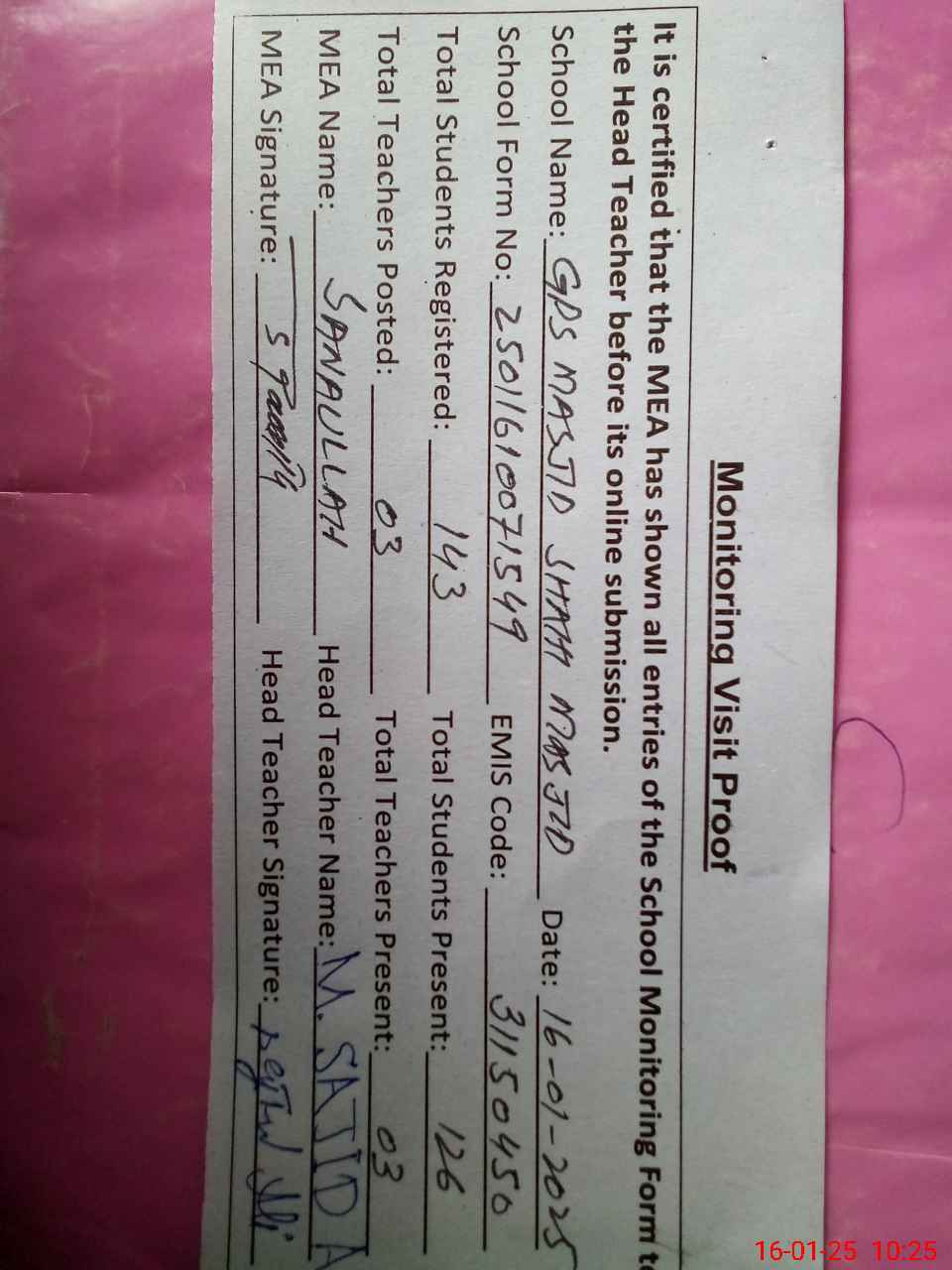 | EMIS Code: 31150450 | Name of School: GPS MASJID SHAHI MASHID | |||