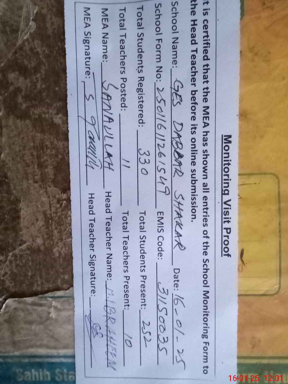 | EMIS Code: 31150035 | Name of School: GES DABBAR SHAKAR GUNJ | |||