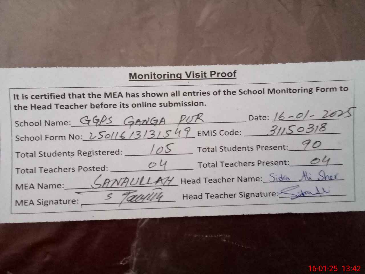 | Attendance Register | Head Teacher | MEA with School | Visit Proof |