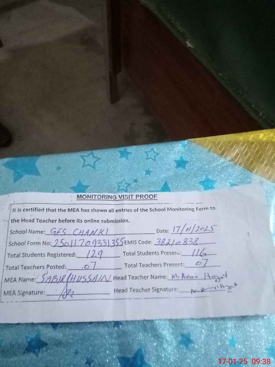 | Attendance Register | Head Teacher | MEA with School | Visit Proof |