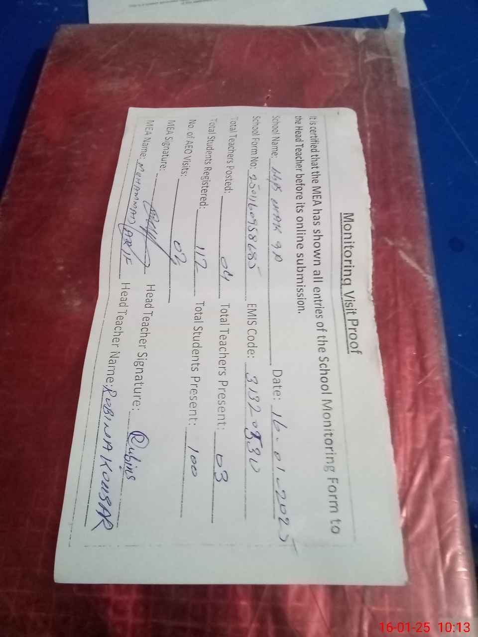 | Attendance Register | Head Teacher | MEA with School | Visit Proof |